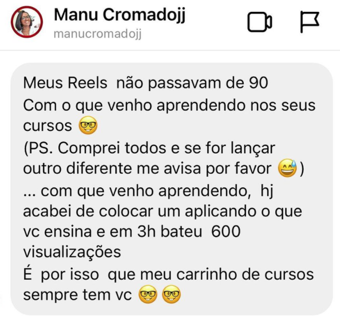Um conjunto de estratégias testadas e validadas por milhares de alunos meus, é o passo a passo de fácil entendimento e que você consegue hoje mesmo começar a criar e editar REELS que tem poder de atrair seguidores para seu insta e gerar vendas todos os dias, mesmo você sendo um completo iniciante!